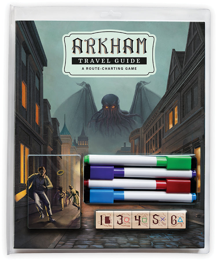 In Arkham Travel Guide, you create tour routes through the grim and narrow streets of Arkham, full of curio shops, mysterious gates and horrible places. During the game, players roll and collectively choose dice that determine where players can draw tourists and chart routes. Your goal is to create a long, continuous route with as many tourists and attractions of different types as possible, as they score you victory points. The game features laminated player boards and dry-erase markers, so it`s very resilient and can be replayed many times without any wear and tear.