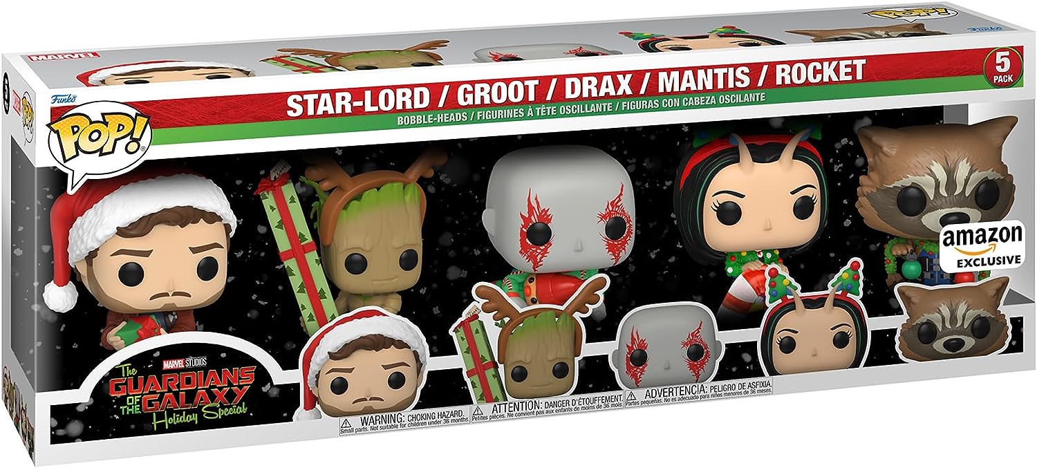 Deck the galaxy this holiday season with an awesome Amazon-exclusive Marvel Studios' The Guardians of the Galaxy Holiday Special 5-Pack of Pops! Pop! Star-Lord, Pop! Groot, Pop! Drax, Pop! Mantis, and Pop! Rocket are dressed for festive heroic fun. Join them for action-packed, holiday-themed adventures through the cosmos. Vinyl bobbleheads are approximately 3.40-4.72-inches tall. Find more Funko products at Amazon